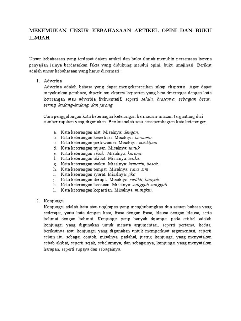 Unsur kebahasaan yang terdapat dalam artikel dan karya ilmiah memiliki persamaan karena penyajian isinya berdasarkan fakta yang dibeberkan unsur karya ilmiah. 3.15 menganalisis sistematika dan kebahasaan karya ilmiah.